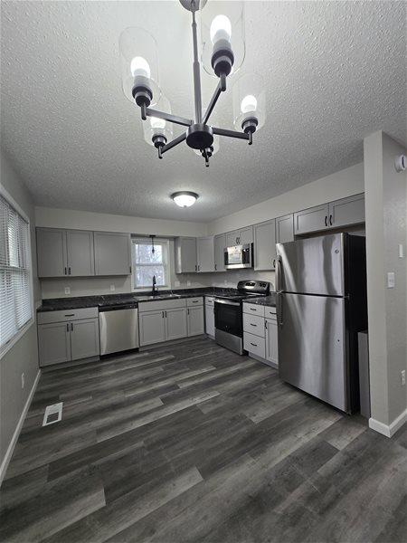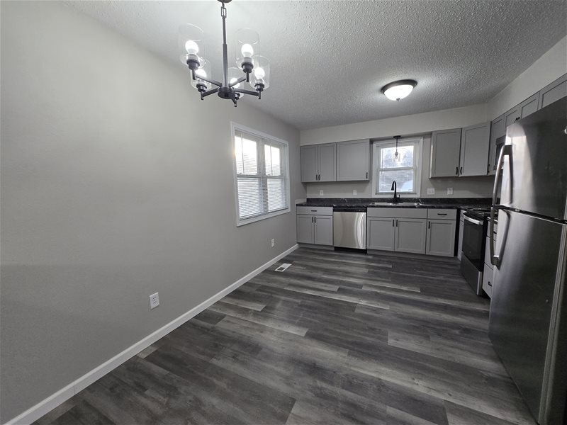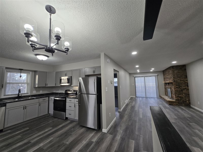 Being fully renovated - all new flooring, trim, baseboards, light fixtures doors and carpet through out. All new cabinets, countertops, sink and appliances. New bathrooms. 2 Original fireplaces 1 on each floor in the 2 living areas. 1 bedroom and bathroom upstairs with the kitchen and 2 bedrooms and a bathroom downstairs with the laundry room.